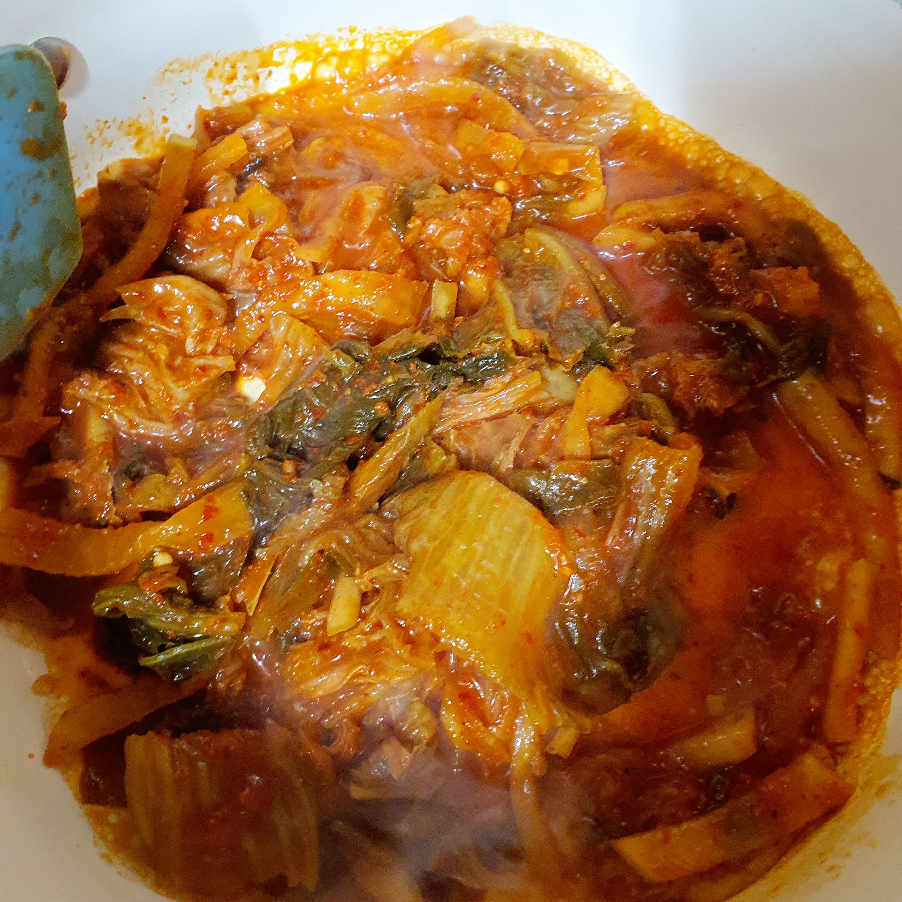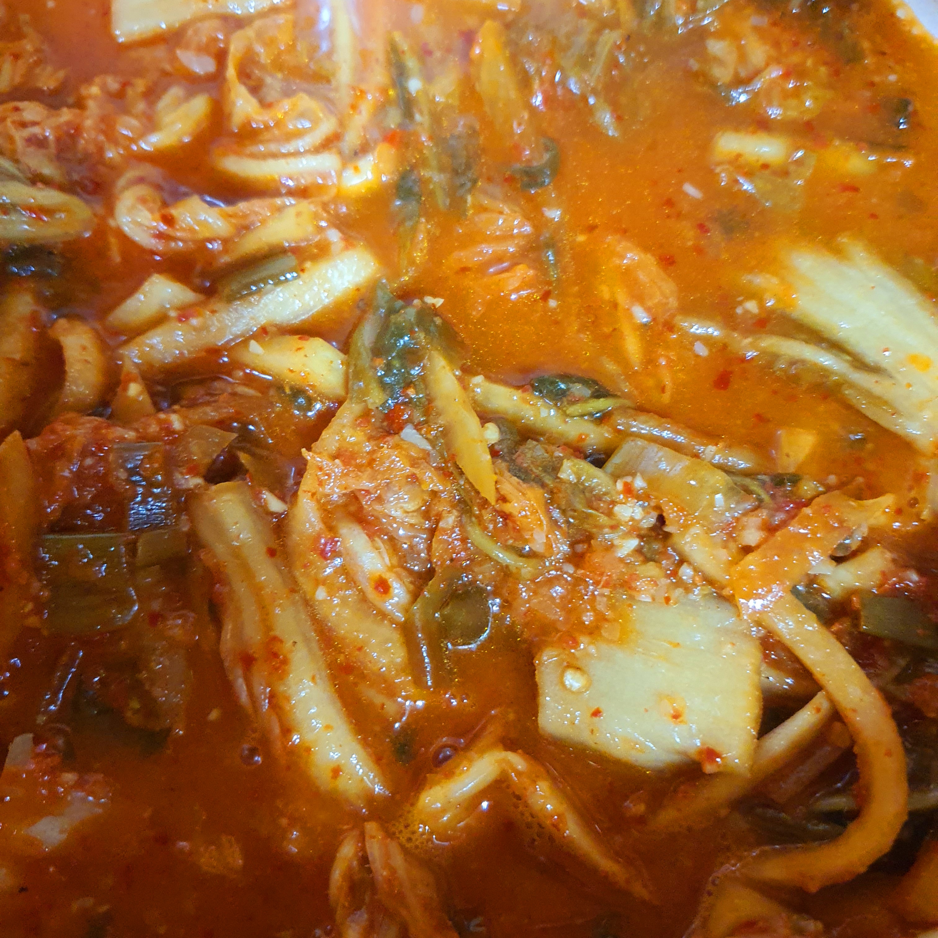 끓이고 난 후 김치는 양념을 흡수해서 풀이 죽고,