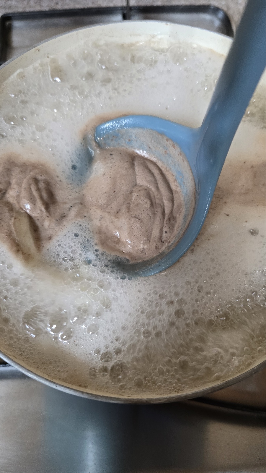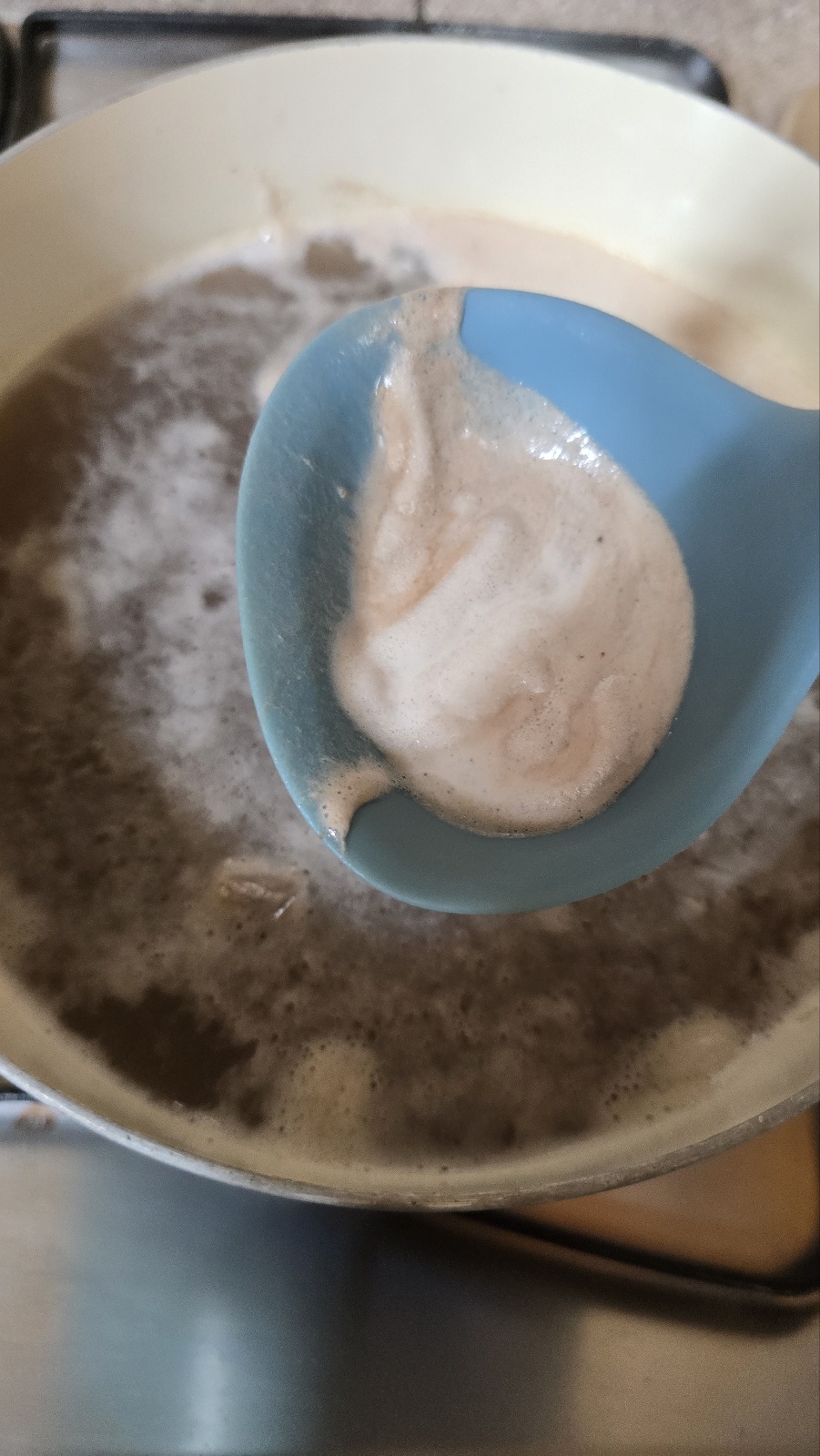 그리고 끓어오르는 거품을 국자로 떠서 제거해 줍니다.