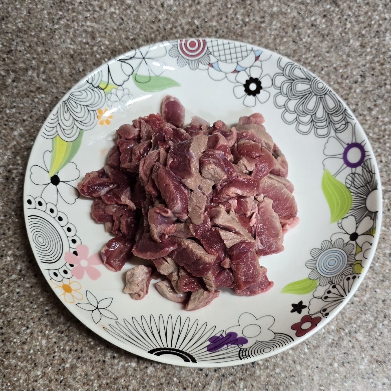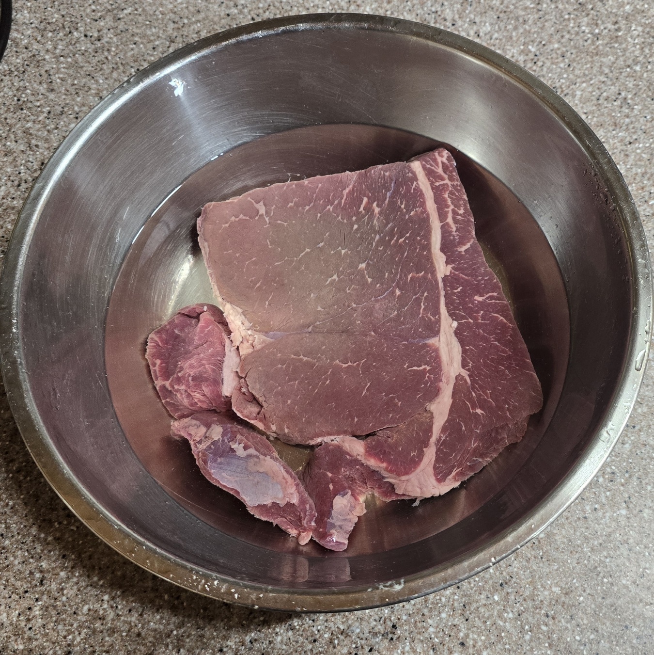 핏기를 제거한 소고기는 먹기 좋은 크기로 썰어줍니다.