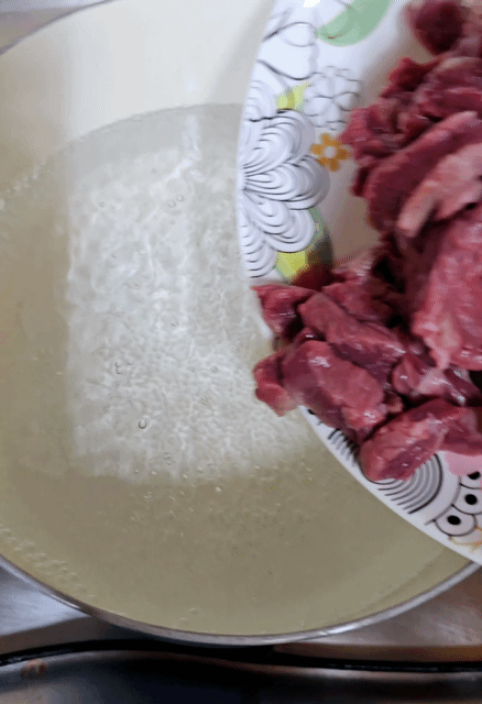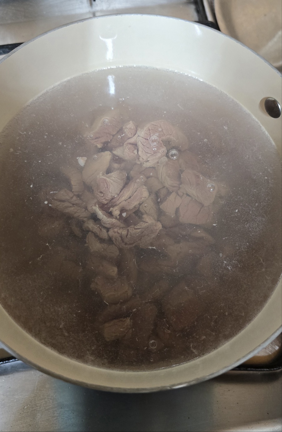 소고기가 익으면서 거품이 끓어오르기 시작합니다.