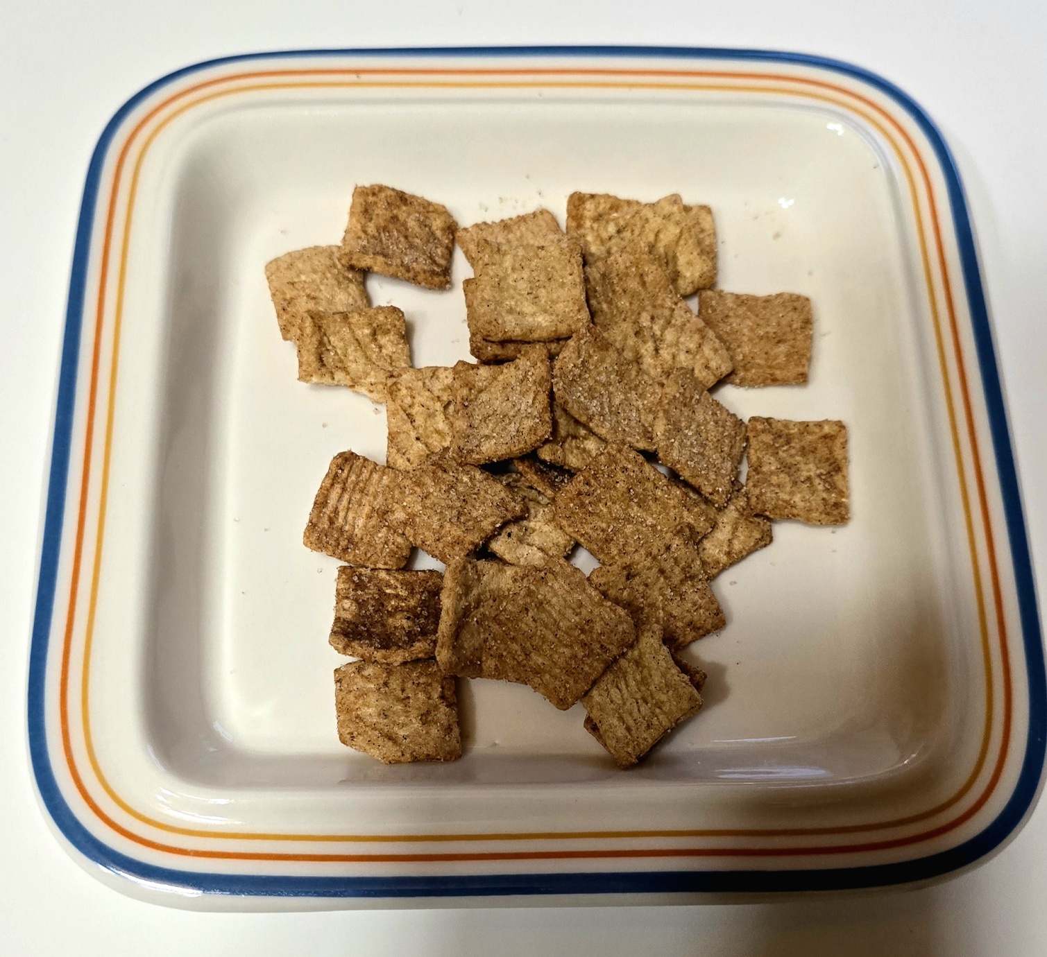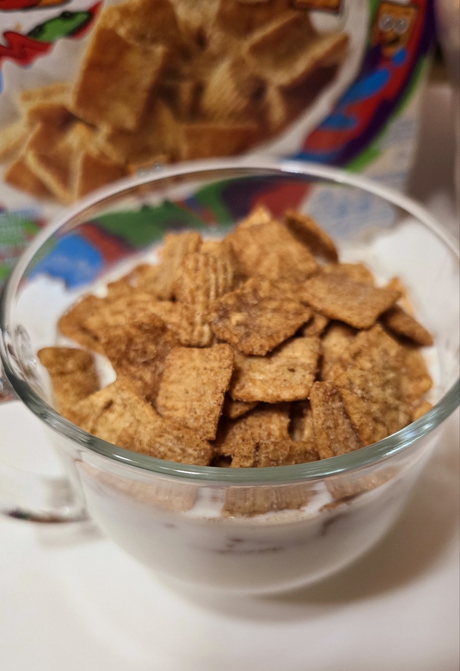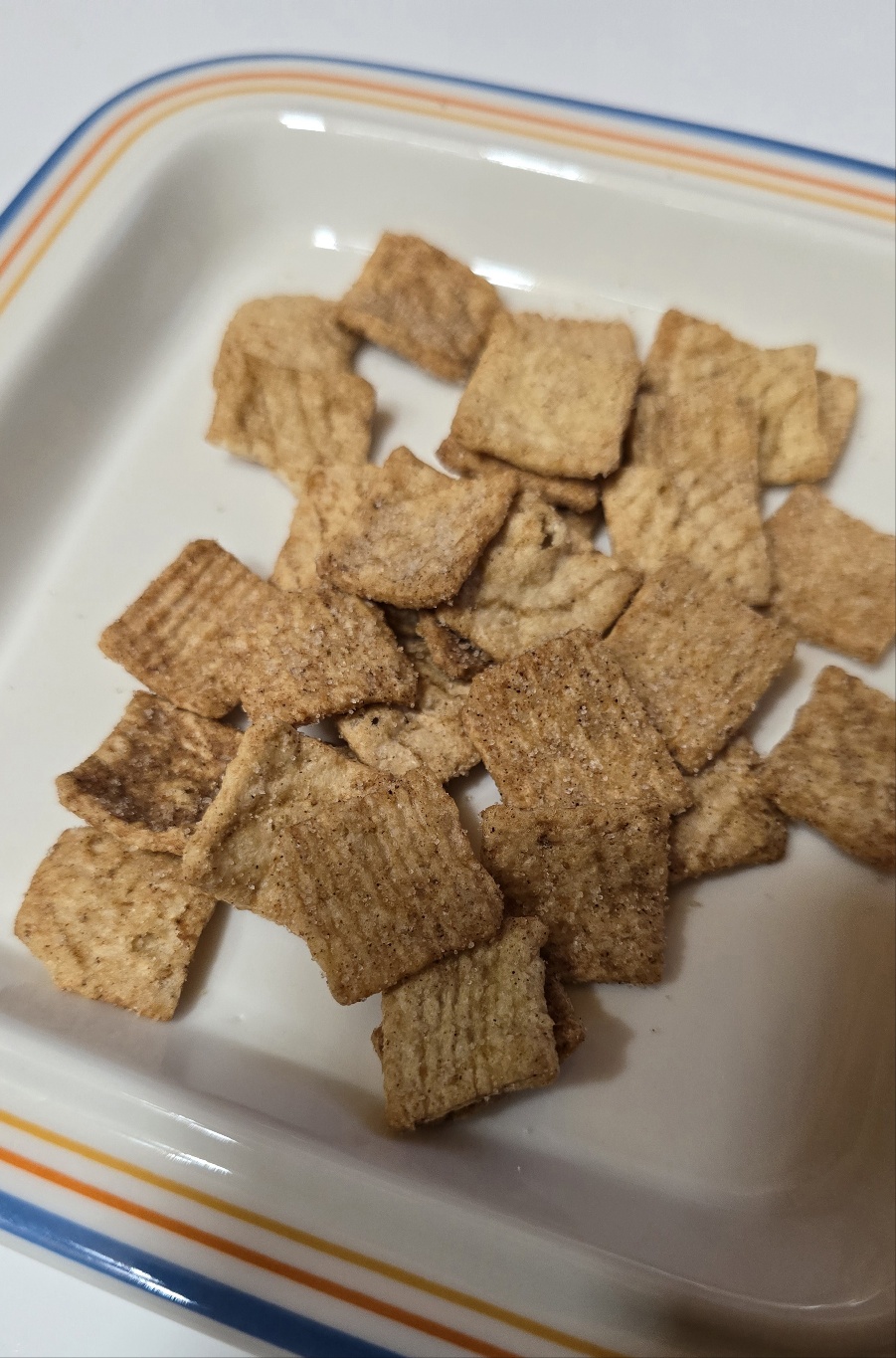 이름처럼 네모난 토스트 모양을 하고 있는 시리얼에는 설탕과 시나몬 가루가 잔뜩 묻어있답니다.