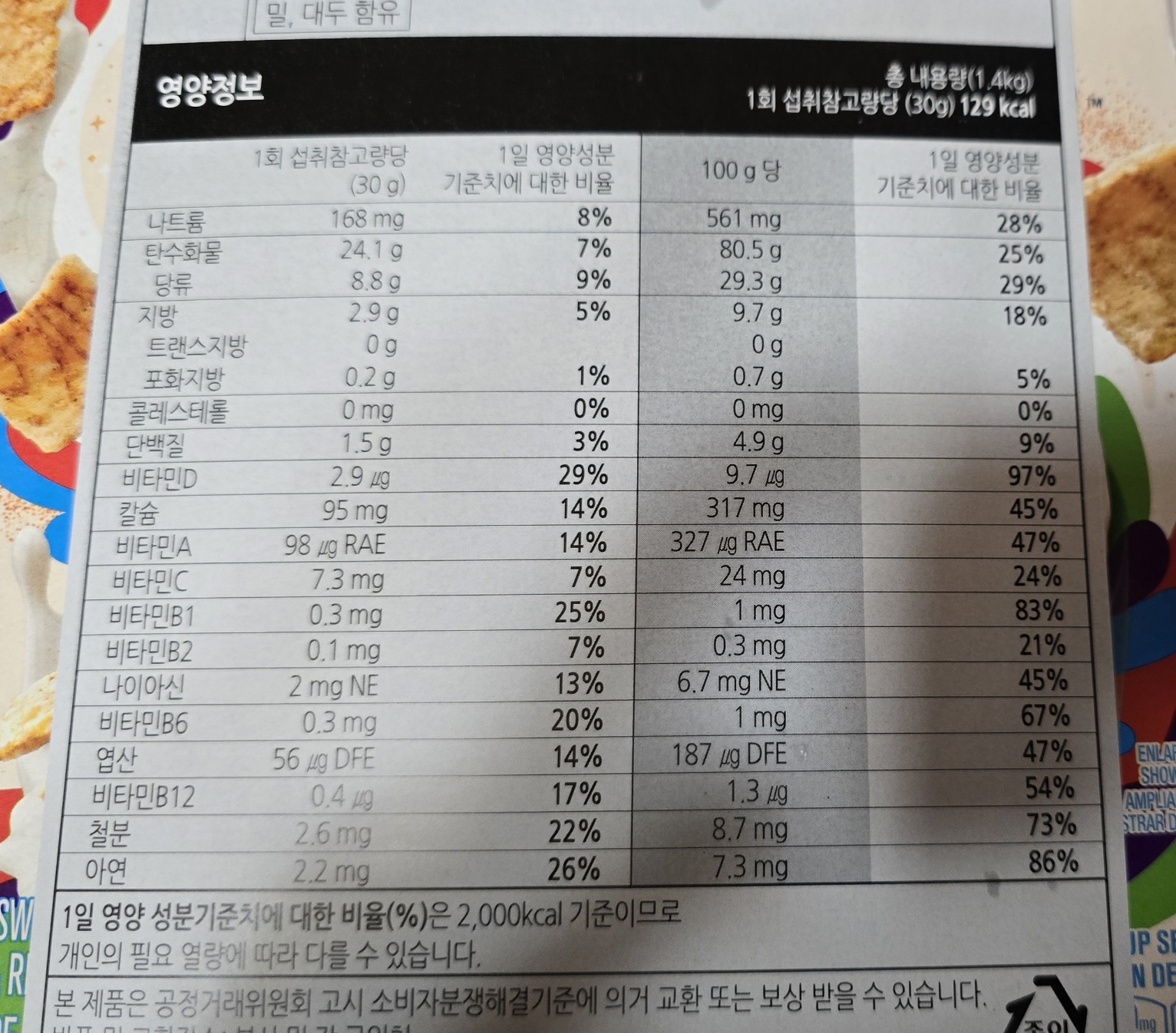 1회 섭취량인 30g 기준으로 칼로리는 129kcal이고, 100g 기준으로도 영양정보가 나와있습니다.