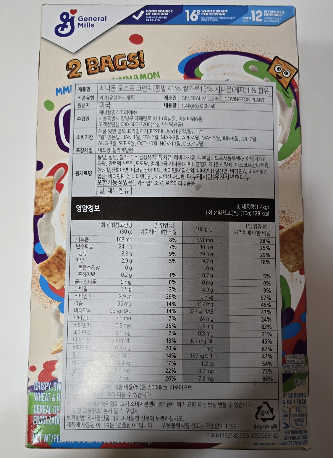 원래는 몰랐었는데 구매하고 나서 보니 시나몬 크런치 토스트 시리얼은 통밀41%, 쌀가루 15%, 시나몬 1%가 함유된 제품이었습니다. 보통 시리얼은 옥수수가 주원료잖아요.