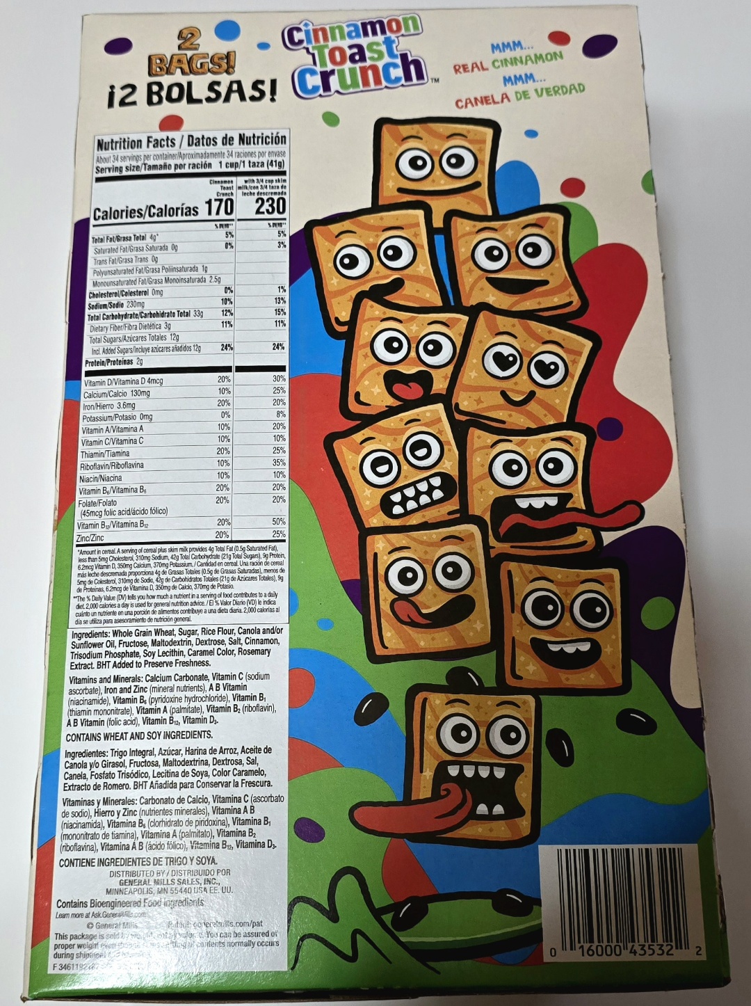 다음은 시나몬 크런치 토스트 시리얼의 영양정보입니다.